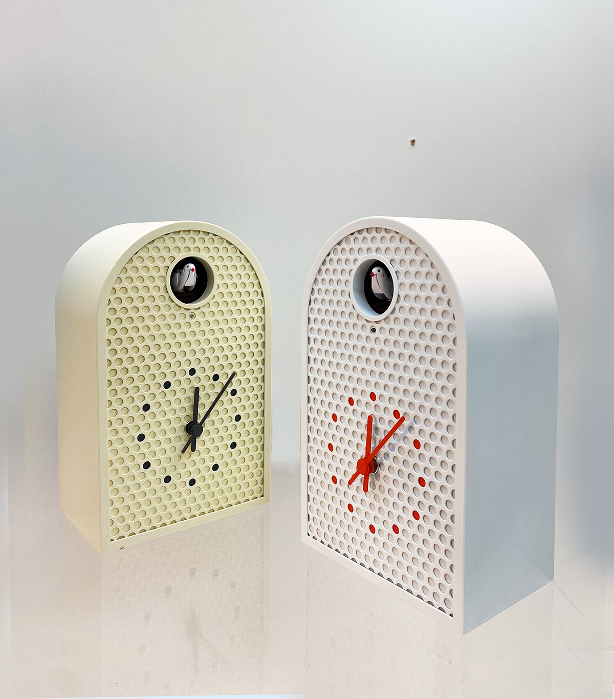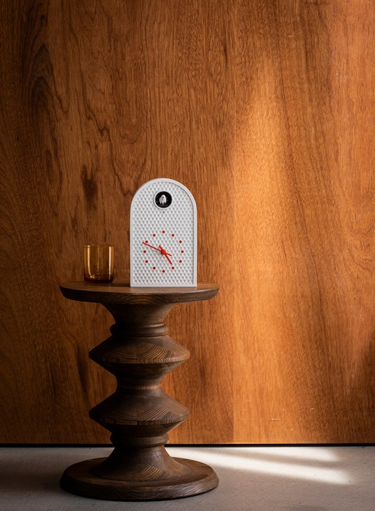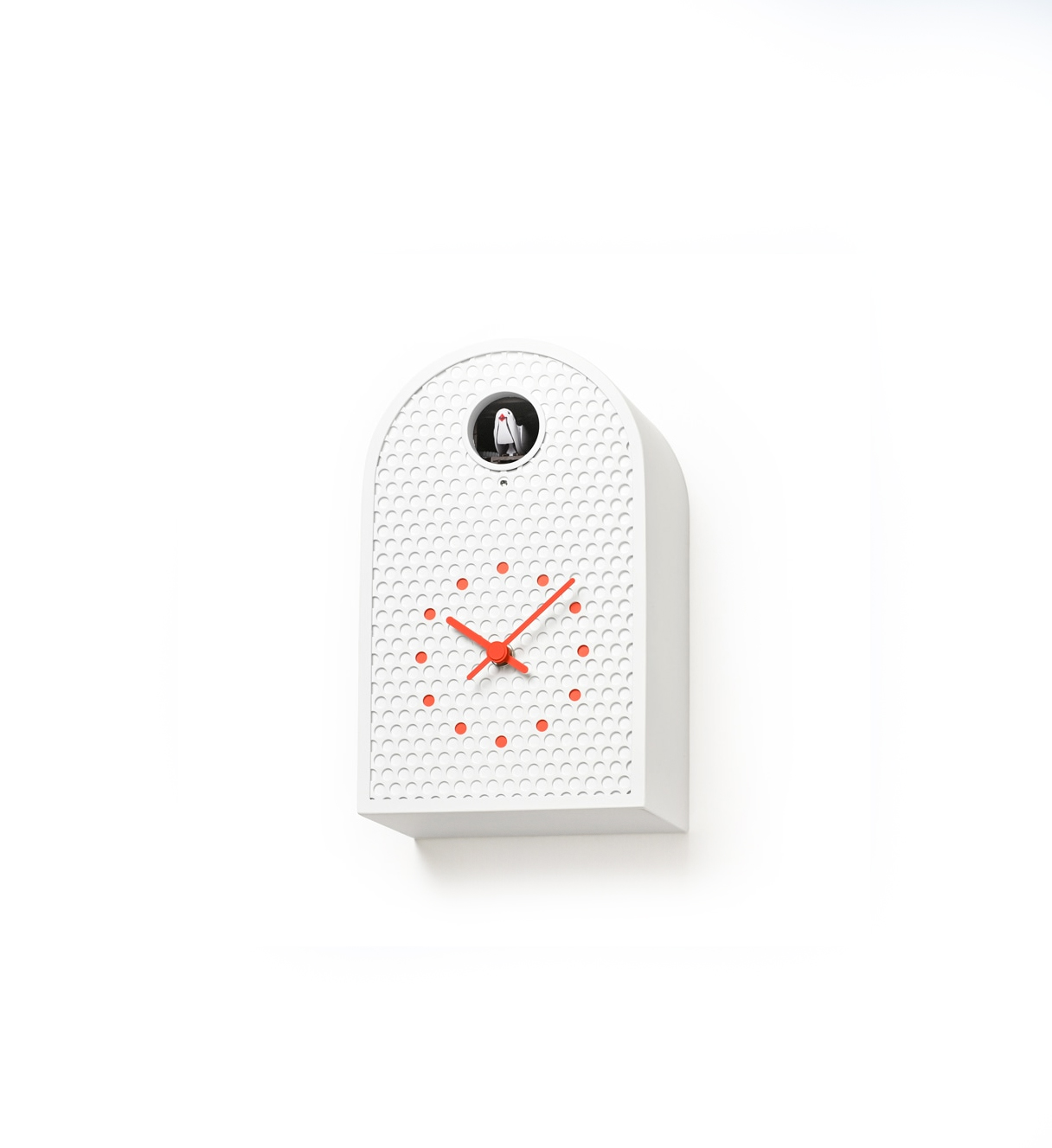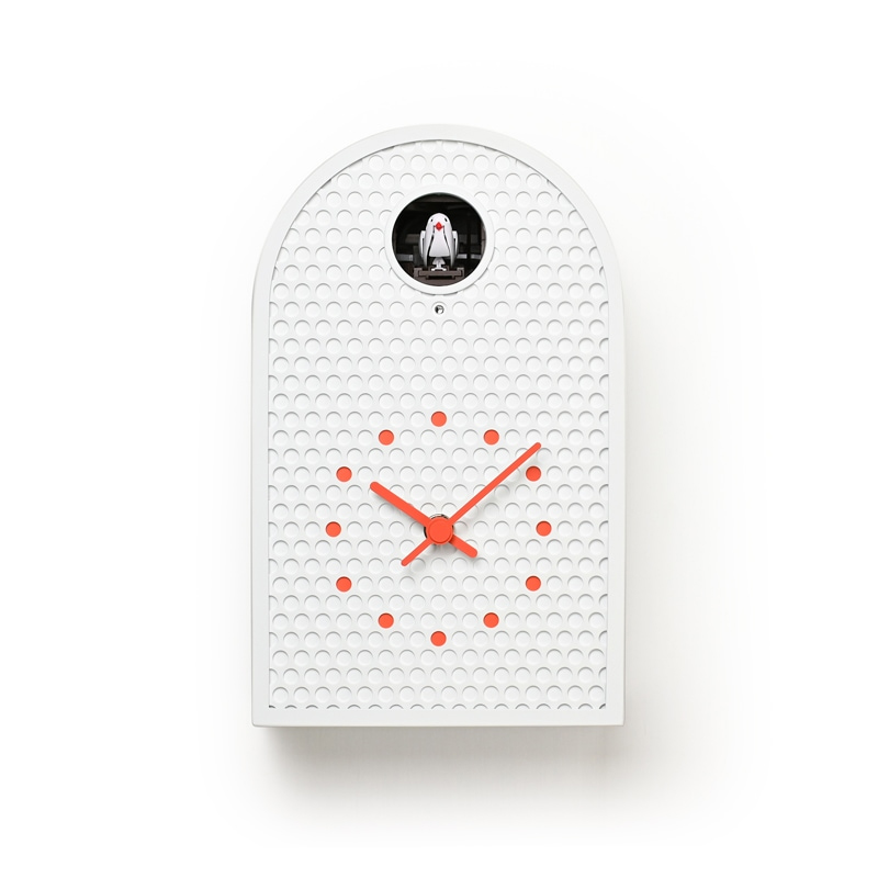 Nieuwe frisse koekoeksklok, gemaakt van geperforeerd metaal met een halfronde behuizing geïnspireerd op westerse boog-ramen. De perforaties zorgen voor een heldere, grafische uitstraling, De kleur van de uurmarkeringen kloppen exact met de positie van de gaten voor een rustig geïntegreerd beeld.