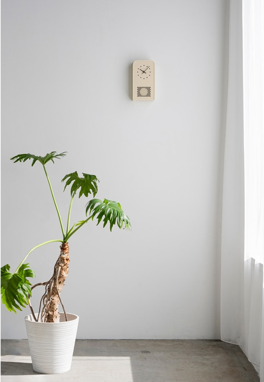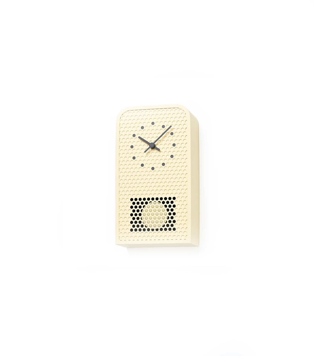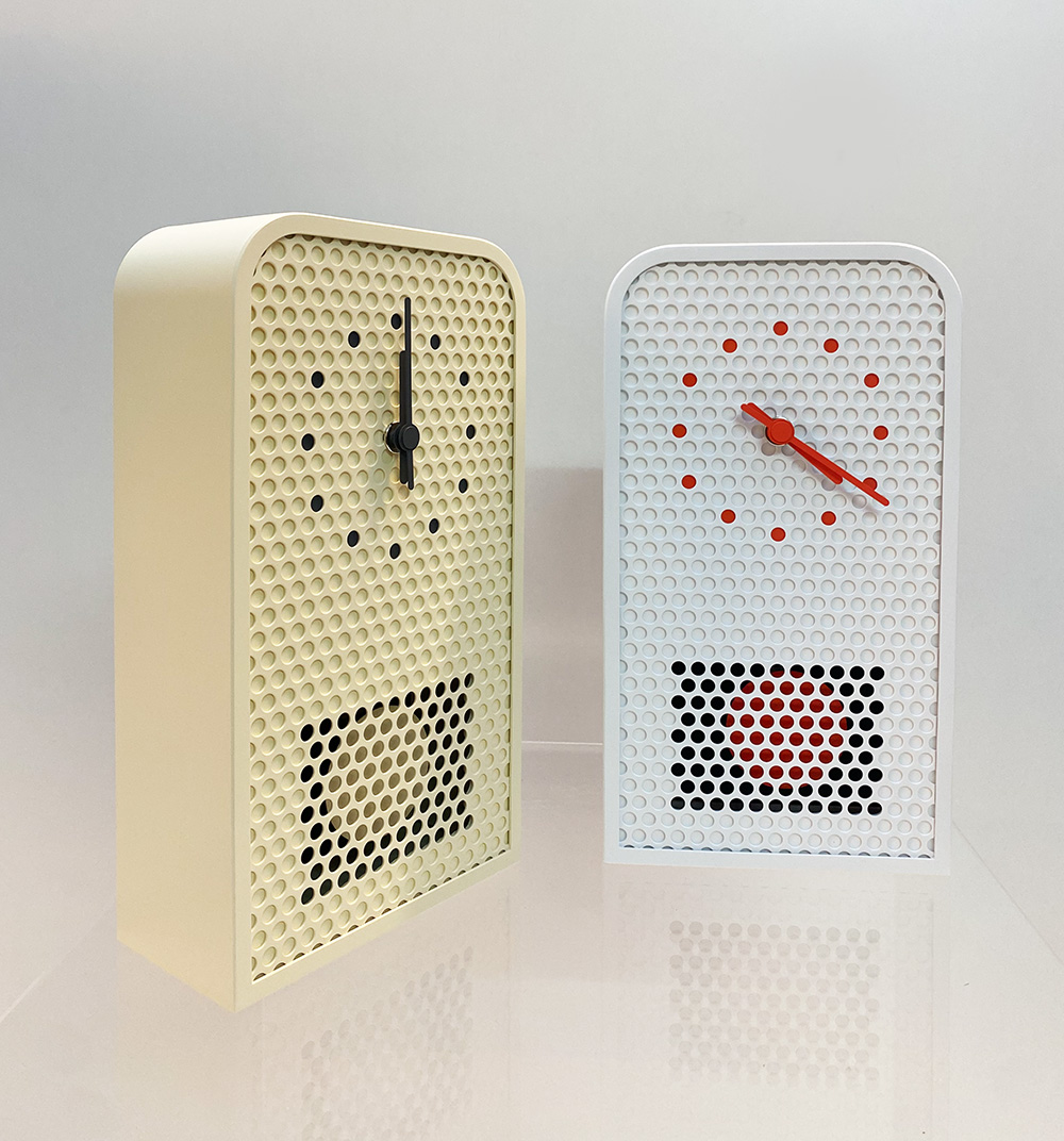MOOV is een metalen slingerklok uit Japan, gemaakt van geperforeerd metaal. De open structuur laat de slinger subtiel door de perforaties zien, wat een moderne twist geeft aan het klassieke slingermechanisme. De wijzers zijn afgestemd op het patroon van de perforaties voor een strak, geïntegreerd geheel.